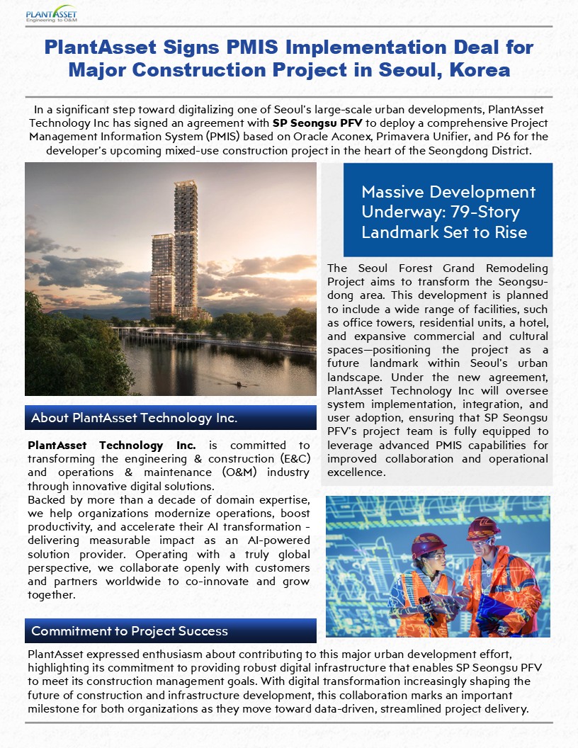 PlantAsset Signs PMIS Implementation Deal for Major Construction Project in Seoul, Korea.